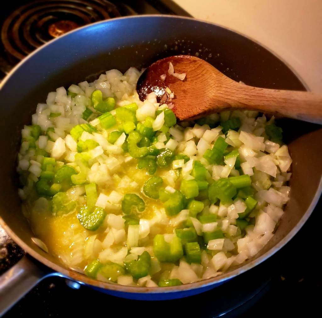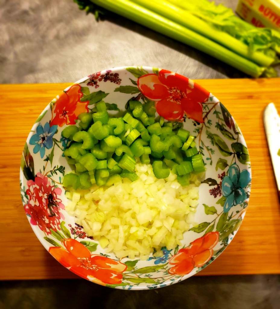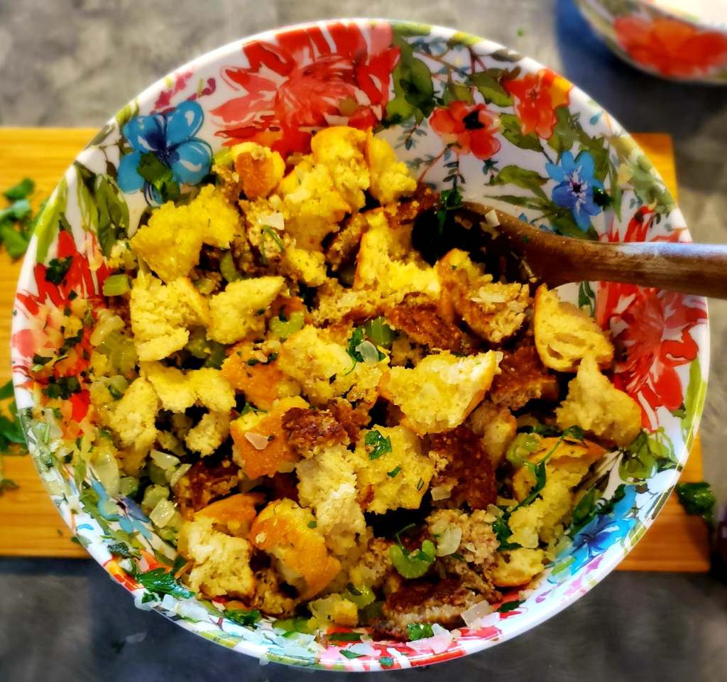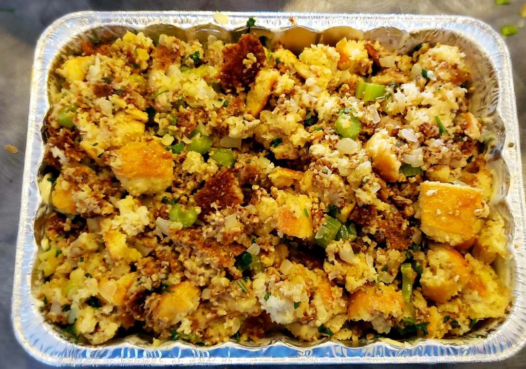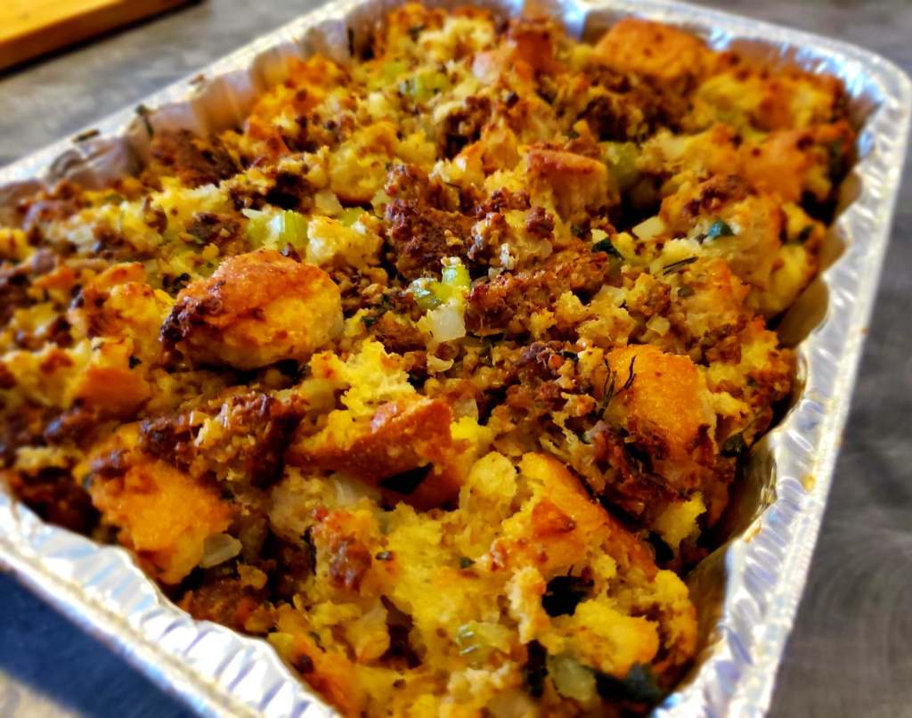 *This stuffing can be made 1 day ahead of time, do everything except the final 40-45 minutes bake. Cover the stuffing once cooled and place it in the refrigerator. When you are ready to serve simply uncover the pan and bake for 45 minutes at 350 degrees.