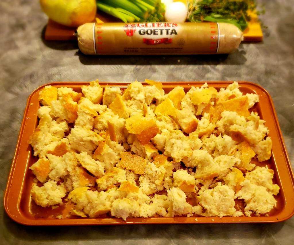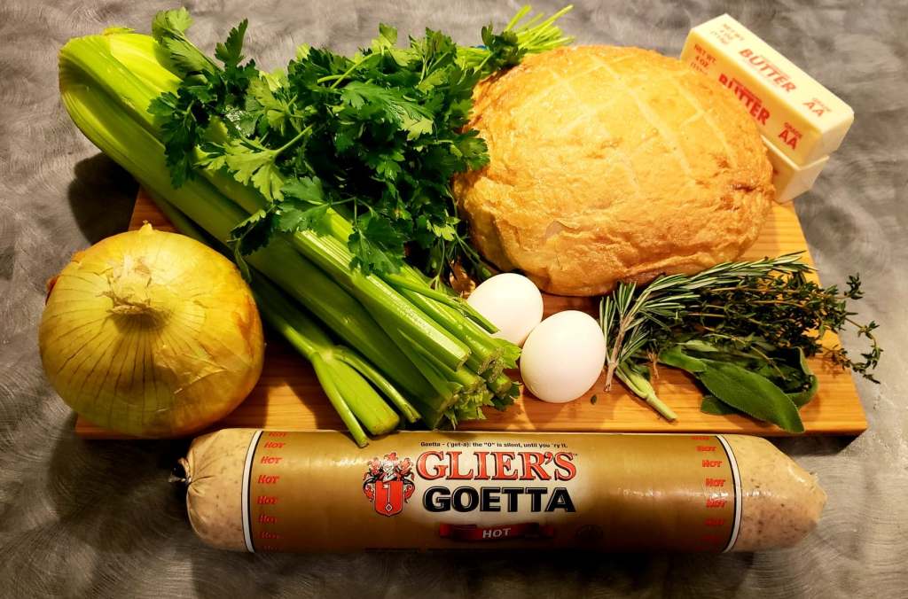 Dice the onion then slice the celery into ¼ inch pieces. Melt the butter in a pan, add the vegetables. Cook over medium heat for 10-12 minutes. This will soften the vegetables. Place the bread pieces in a large bowl, pour the butter and vegetable mixture over the bread. Add the parsley, sage, rosemary, thyme, salt, and pepper. Mix to coat the bread pieces. Add 1 ¼ cups of chicken broth to the bowl, toss lightly. Break the pieces of Goetta in halves and add to the mixture, stir just to combine. In a small bowl whisk the eggs and ¼ cup of broth. Make sure the bread mixture is not hot before adding the eggs, you do not want the eggs to start cooking in the bowl. Pour the eggs into the mixture and stir. Pour the mixture into the pre-buttered baking pan. Cover with foil and bake for 40 minutes. Remove the foil and bake for another 40-45 minutes until the top is golden brown.